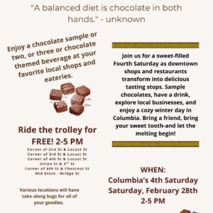 Join us for a sweet-filled 4th Saturday as downtown shops and restaurants transform into delicious tasting shops. Sample chocolates, have a drink, explore local businesses, and enjoy a cozy winter day in Columbia. Bring a friend, bring your sweet-tooth,file:///C:/Users/mlmcf/Downloads/Chocolate%20Meltdown%20(1).pdf and let the melting begin.