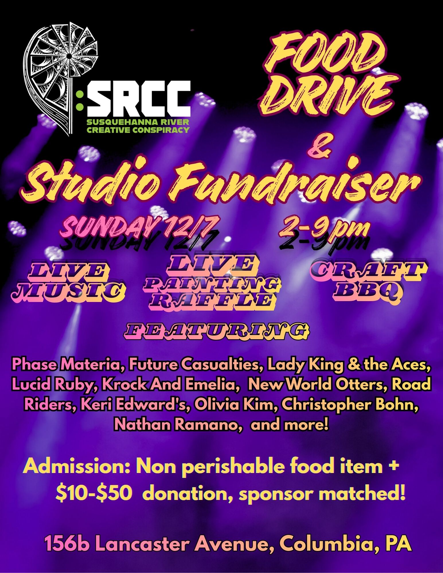 Join us for a full day of live music, delicious food, and community support as we raise funds for the Susquehanna River Creative Conspiracy (SRCC)!
